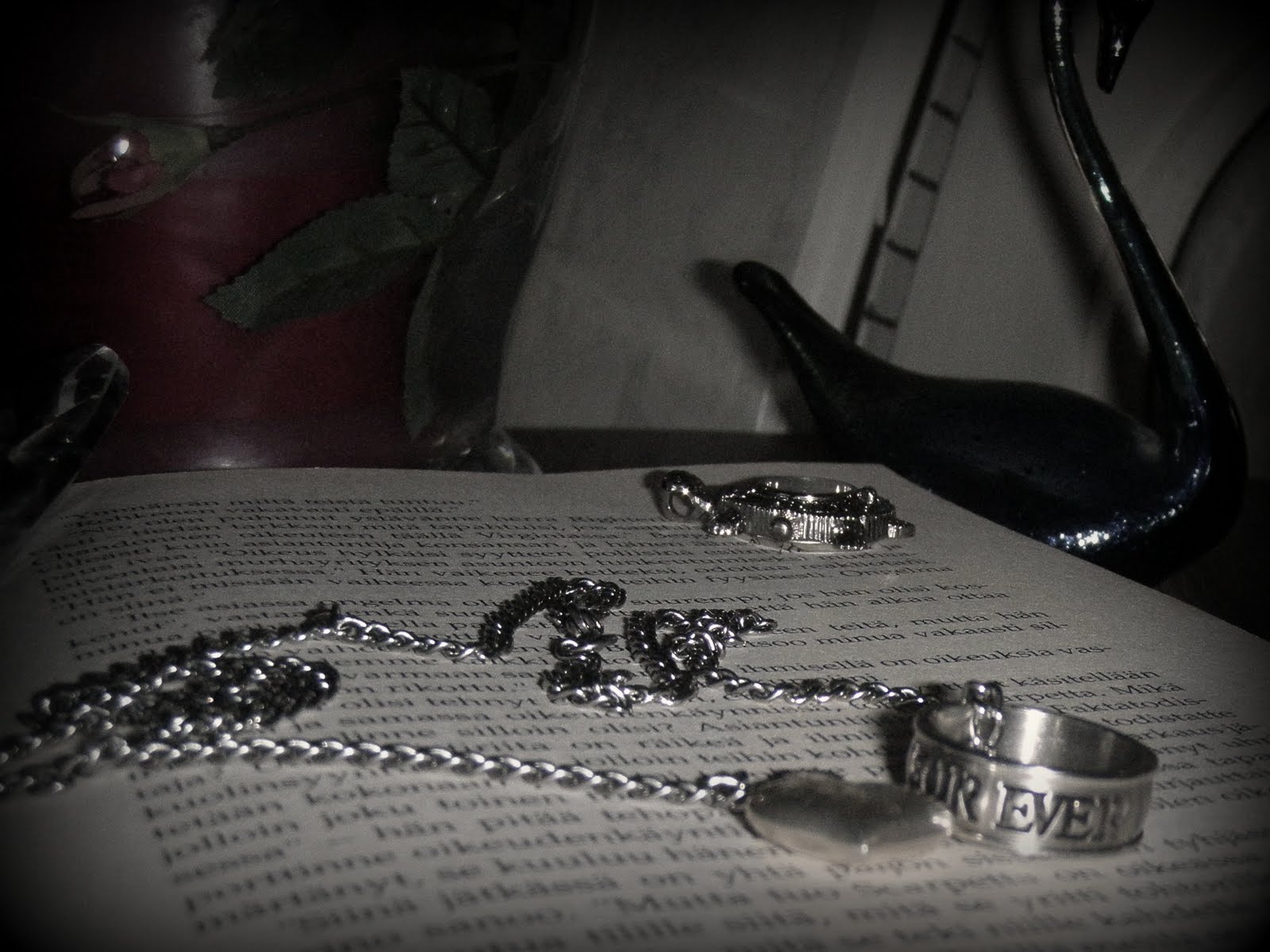 Laitoin mun pikkusiskon ottamaan taiteellisen kuvan mulle tärkeistä esineistä ja tämä on tulos. XD Tässä nyt pitäis nätisti olla huomion keskipisteenä toi ketju ja siinä oleva sormus ja sydän, mutta mun huomio ainakin kiinnittyy enemmän tohon kilpikonnakelloon, joka ei oikeasti kuuluis tähän kuvaan edes~ Mut oikeastaan se joutsen siellä takana voiskin vaikka kuulua ihan vaan siksi, että siitä tulee mieleen se aika lapsuudesta, kun kaikki oli vielä hyvin tai ainakin luulin niin. XD